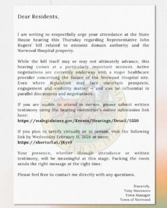 Norwood needs your help this Thursday! A public hearing will be held from 2 to 5 p.m. at the State House on Thursday, Feb. 12,…