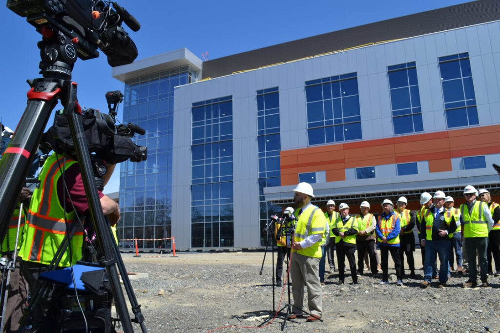 Norwood General Manager Tony Mazzucco and the Finish Norwood Hospital Task Force toured the construction site and spoke to the media on Friday, April 18, 2025. (Photo Courtesy Town of Norwood)